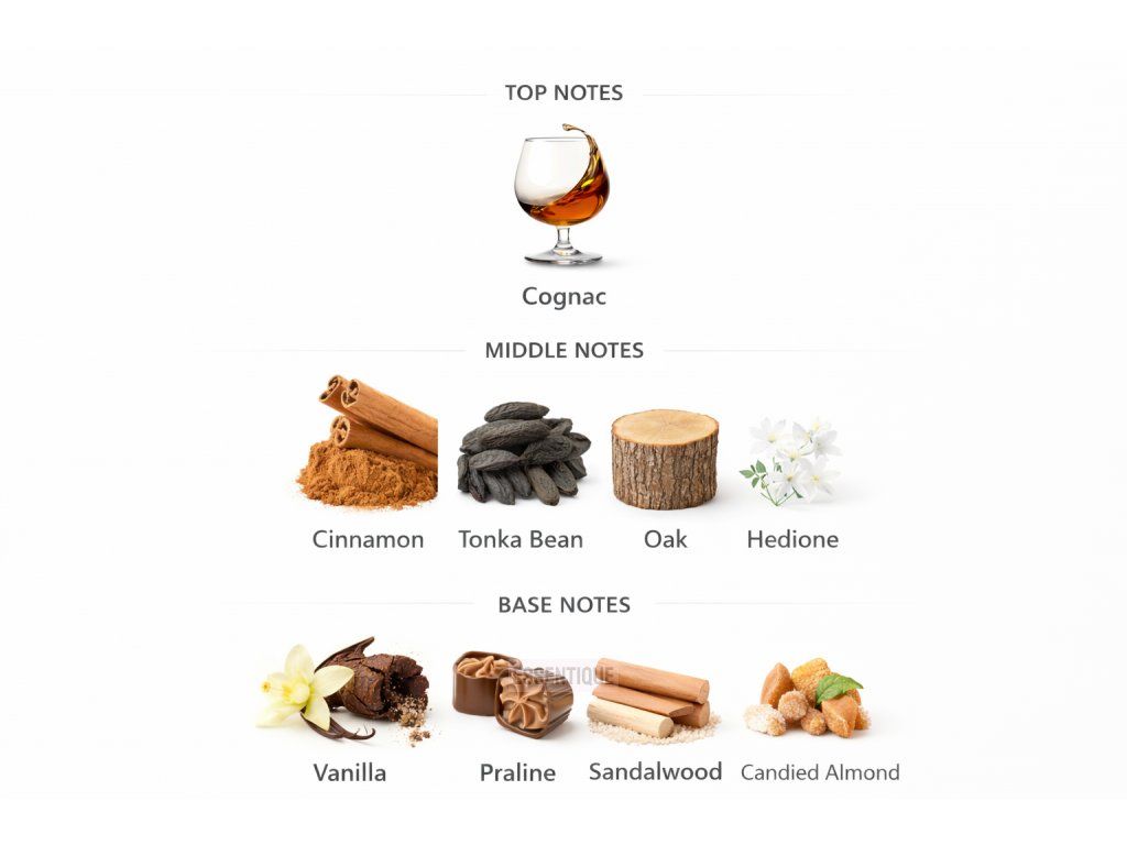 V základe sa objavuje krémová kombinácia vanilky, praliné a santalového dreva, doplnená o dubový akord, ktorý vôni dodáva jemnú dymovosť a elegantnú hrejivosť.