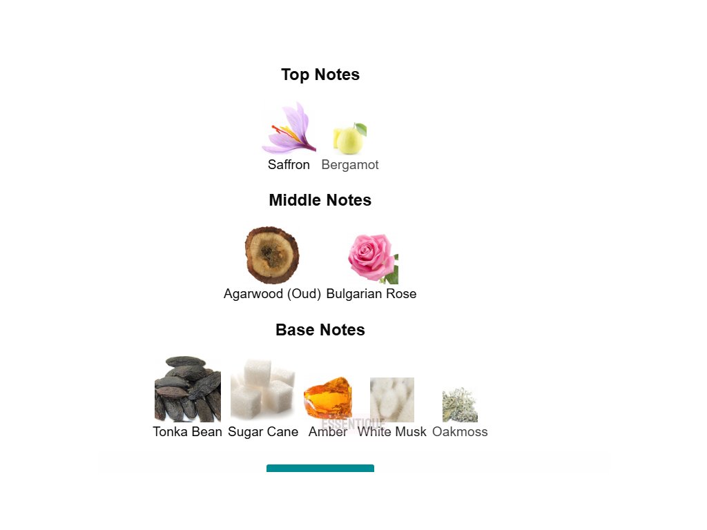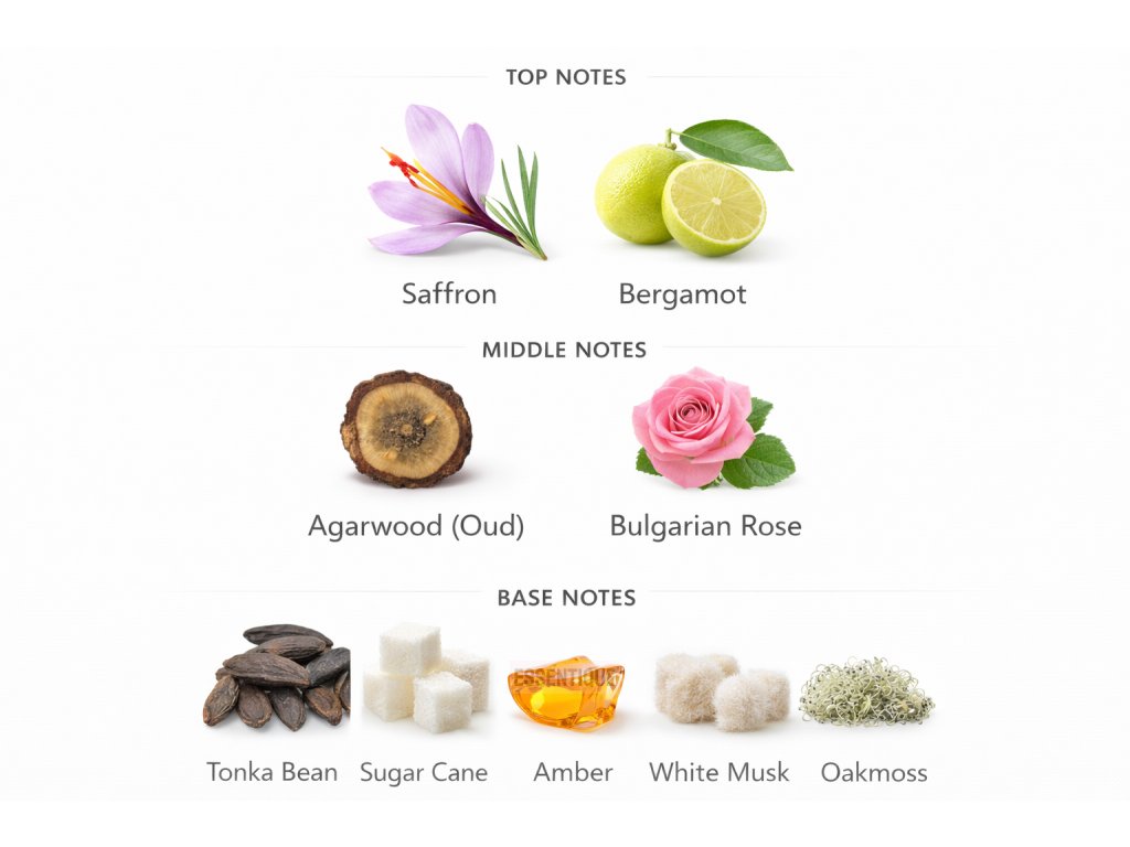 V úvode vás privíta iskrivá kombinácia šafranu a bergamotu, ktorá okamžite prebudí zmysly a pripraví pôdu pre dramatické srdce vône. V jeho centre sa rozvinie agarové drevo (oud) so svojou živočíšnou intenzitou, zjemnené ušľachtilou bulharskou ružou, ktorá dodáva kompozícii noblesu a zmyselnosť.