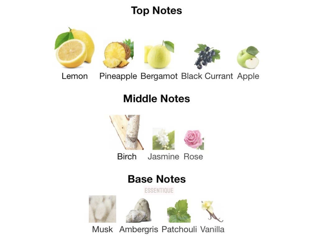 Hneď v úvode vás privíta citrón, bergamot, ananás, jablko a čierne ríbezle, ktoré dodajú energiu a sviežosť. Potom sa pridáva breza, jazmín a ruža, ktoré vôni dávajú dymový, korenistý a zároveň elegantný charakter.