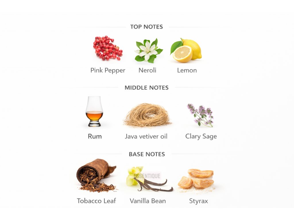 V úvode vás privíta ružové korenie, neroli a citrón, ktoré dodávajú sviežosť a jemnú pikantnosť. Potom sa rozvinie bohaté srdce vône – rum absolue, vetiver a šalvia, ktoré prinášajú hrejivý, opojný charakter.