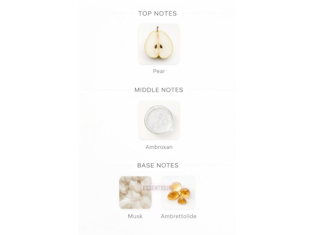 Základ tvorí krémové biele pižmo, ktoré vôni dodáva hebkosť a čistotu. Vytvára efekt „čistej pokožky“, vďaka čomu parfum pôsobí veľmi prirodzene, intímne a ľahko nositeľne.