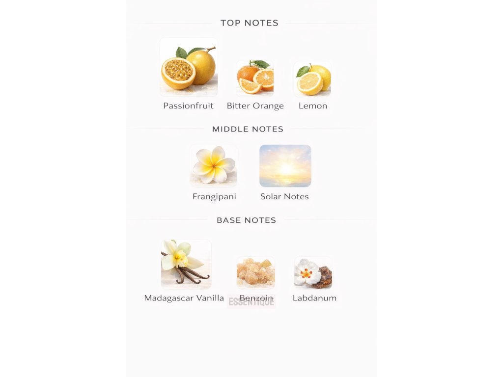 Otvára sa šťavnatou marakujou, horkým pomarančom a citrónom. V srdci dominuje exotický kvet frangipani, ktorý vôni dodáva krémovosť a ženskú jemnosť.