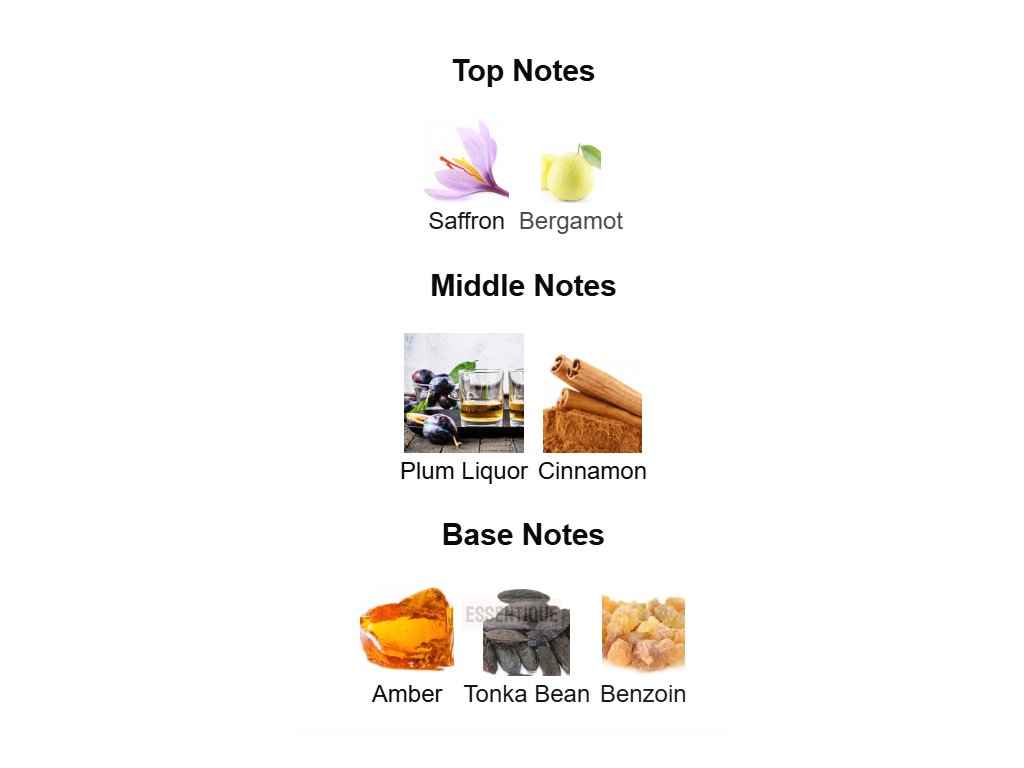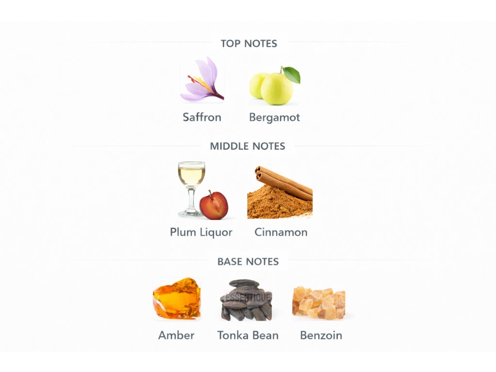 V úvode vás privíta bergamot so sviežou citrusovou iskrou a šafrán, ktorý dodáva luxusný, jemne sladkastý a korenistý nádych. Srdce vône tvorí opojný slivkový likér a hrejivá škorica, ktoré prinášajú bohatú, zmyselnú hĺbku.