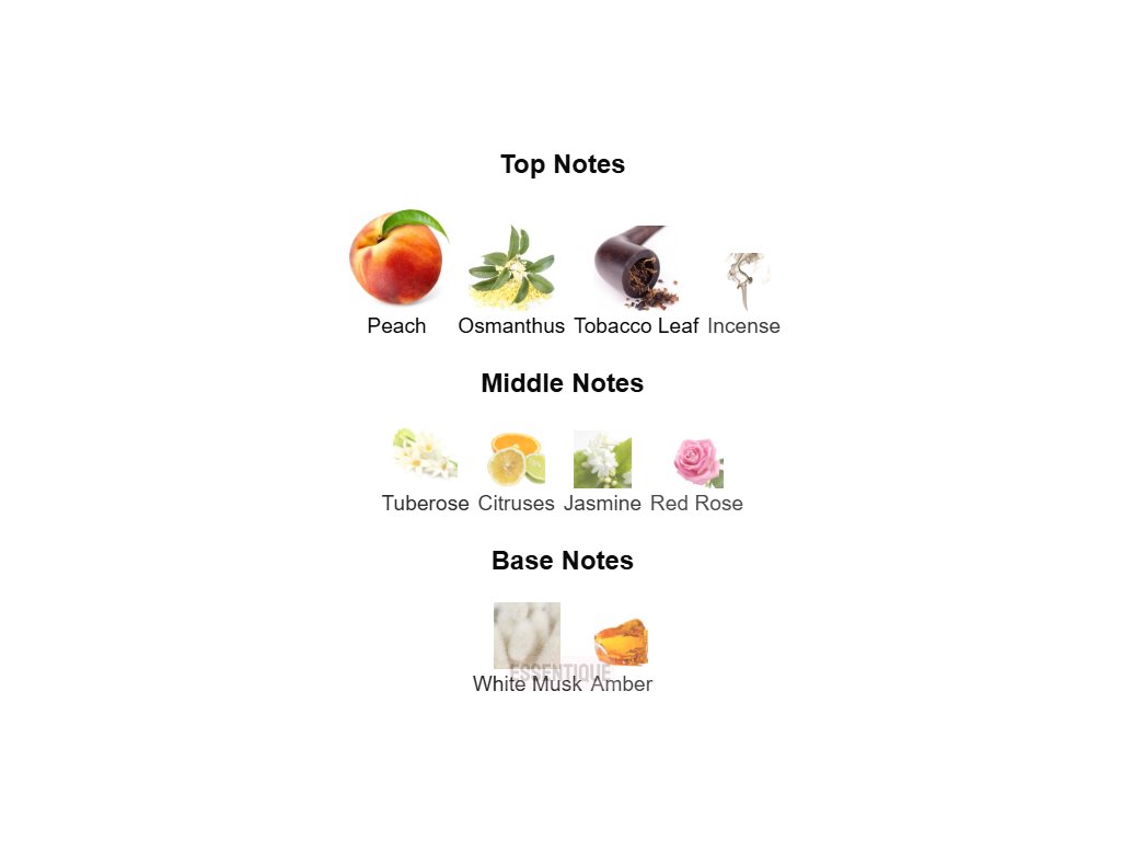 V úvode vás privíta broskyňa, osmanthus, tabakový list a kadidlo – odvážna kombinácia sladkého ovocia a dymového závoja, ktorá okamžite upúta pozornosť.