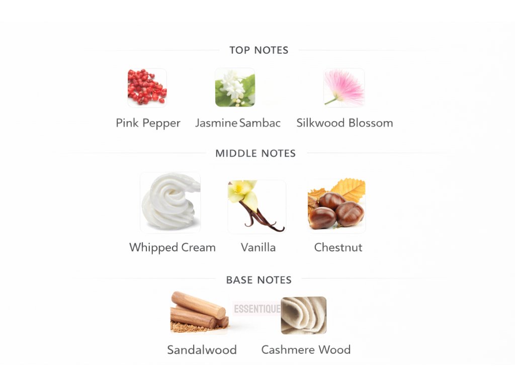 • Srdce (middle notes): vanilka, šľahačka, gaštan – sladké, gurmánske tóny, ktoré vytvárajú krémovú a hrejivú atmosféru.
