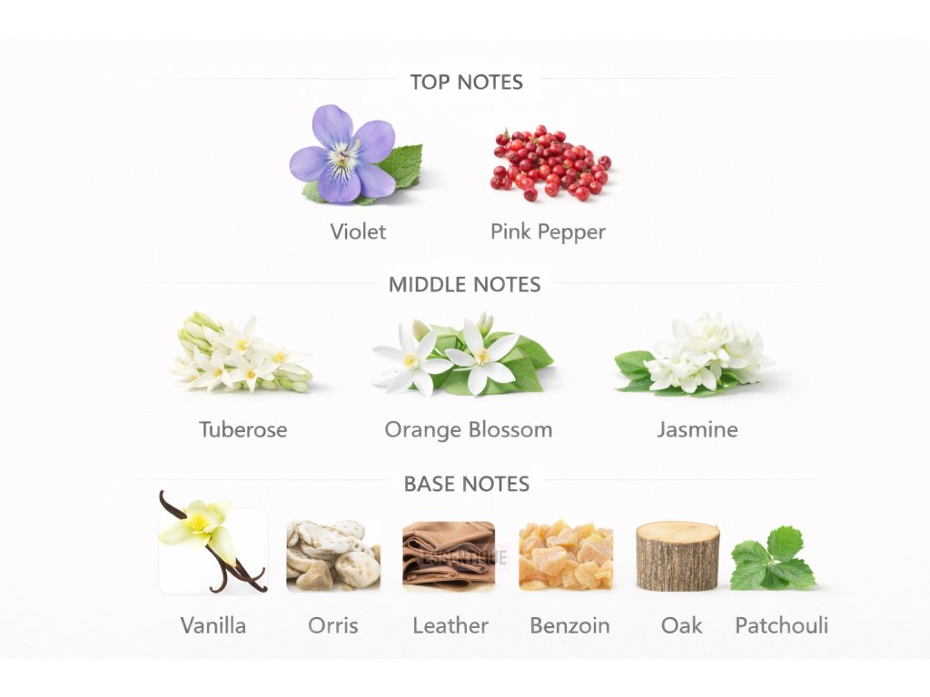 Základ je hrejivý a zmyselný: pačuli, benzoin, dubové drevo a kožený akord vytvárajú krémovo‑dymovú stopu, ktorá zostáva na pokožke celé hodiny.