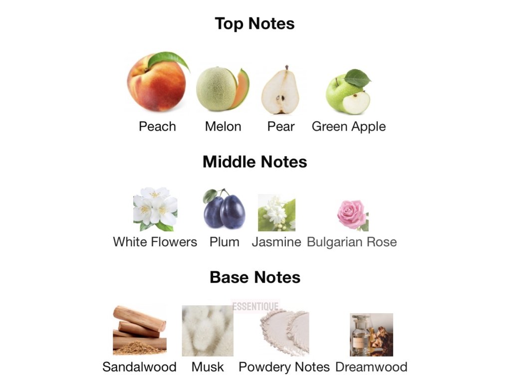 • Základ (base notes): santalové drevo, dreamwood™, pižmo, pudrové tóny – hrejivý, zmyselný a čistý základ, ktorý zanecháva jemnú stopu na pokožke.
